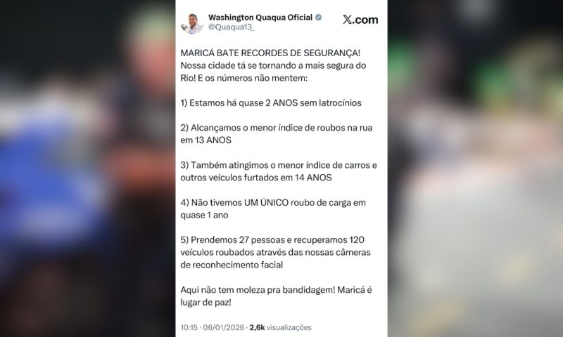 Em 2025, Maricá não teve registros de latrocínios – roubo seguido de morte – e roubos de carga, segundo dados da secretaria de Segurança Cidadã, divulgados nesta quarta-feira (7). De acordo com a pasta, a cidade não possui casos de latrocínio desde fevereiro de 2024. O levantamento também apontou o menor índice de letalidade violenta há mais de duas décadas. Através de suas redes sociais, o prefeito do município, Washington Quaquá, afirmou “nossa cidade está se tornando a mais segura do Rio”.