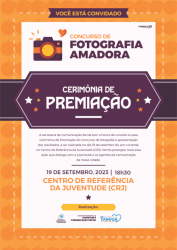 A prefeitura de Tanguá, por meio da secretaria de Comunicação e Juventude, tem a honra de convidar a todos para conhecer os vencedores do 1º Concurso de Fotografia do município. O resultado será anunciado no dia 19 de setembro de 2023, às 18:30h, no Centro de Referência da Juventude, na Ampliação.