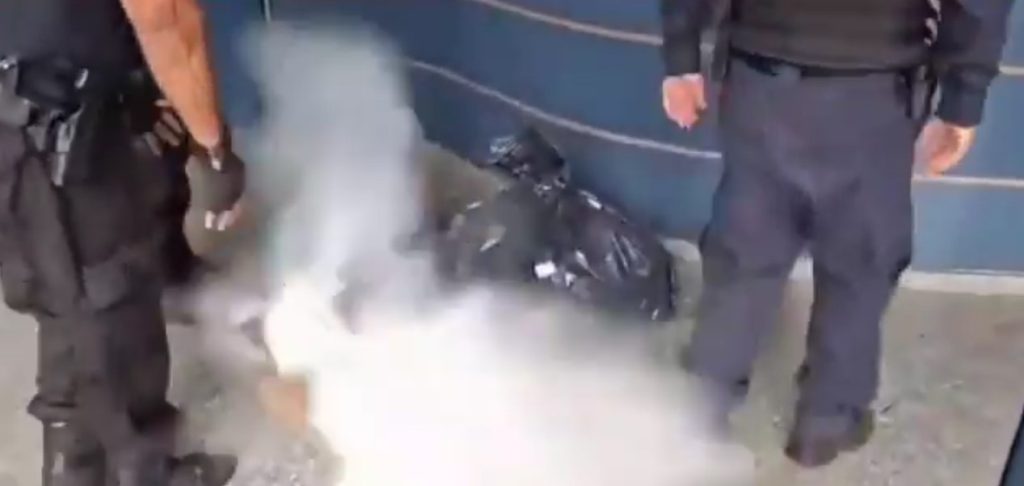 Nas imagens, um subtenente da Polícia Militar carrega uma caixa que conteria diversos frascos de lança-perfume. Ao arremessar o objeto próximo a outras sacolas com drogas já recolhidas, a caixa acaba explodindo, provocando um forte impacto e atingindo os policiais que estavam no local.