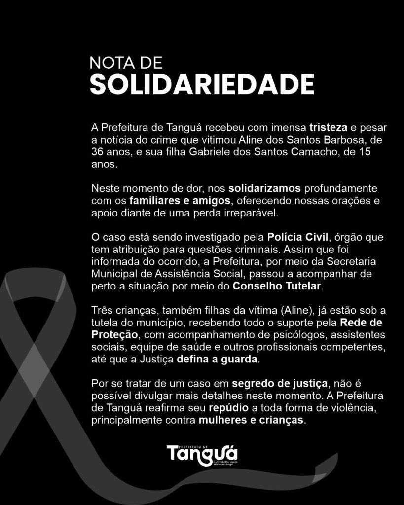 A Prefeitura de Tanguá emitiu uma Nota de Solidariedade pela morte de mãe e filha.