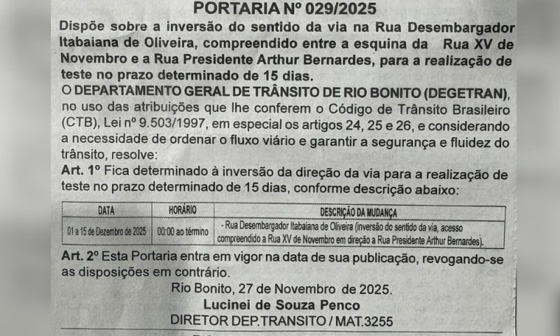 A partir desta segunda-feira (01/12), a Rua Desembargador Itabaiana de Oliveira, onde fica localizada a Câmara de Vereadores de Rio Bonito, no Centro, terá o sentido do fluxo de veículos invertido. Ao invés do motorista entrar pela Câmara, vai sair por ela, acessando a via entre as esquinas do Destacamento da Polícia Militar e a hamburgueria Toca.