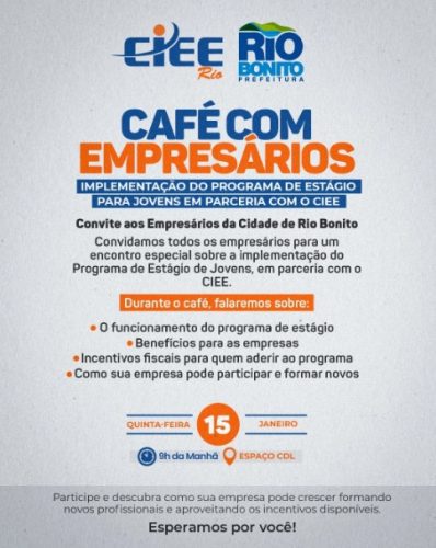 Na próxima quinta-feira (15), os empresários de Rio Bonito têm um “Café com Empresários” para falar sobre o programa de estágio para jovens. A iniciativa é da Prefeitura, através da Secretaria de Trabalho e Desenvolvimento Econômico, em parceria com o Centro Integrado Empresa-Escola (CIEE).