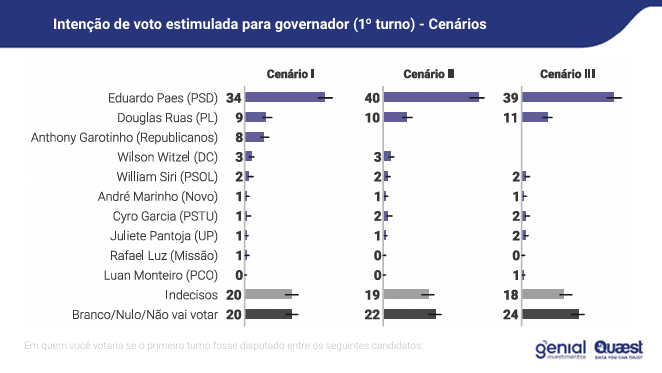 Na avaliação encomendada pela Genial Investimentos, que ouviu 1.200 pessoas entre os dias 21 e 25 de abril, Eduardo Paes aparece com 34% das intenções de voto à frente de outros nove pré-candidatos a governador.