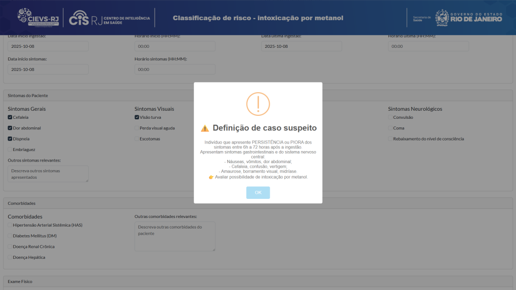 O Governo do Rio de Janeiro, por meio da Secretaria de Estado de Saúde (SES-RJ), lança nesta quarta-feira (08/10) uma ferramenta digital que apoia profissionais de saúde na avaliação dos casos de intoxicação por metanol. Nas Unidades de Pronto Atendimento da rede estadual, o link já está disponível para acelerar e aumentar a precisão do diagnóstico.